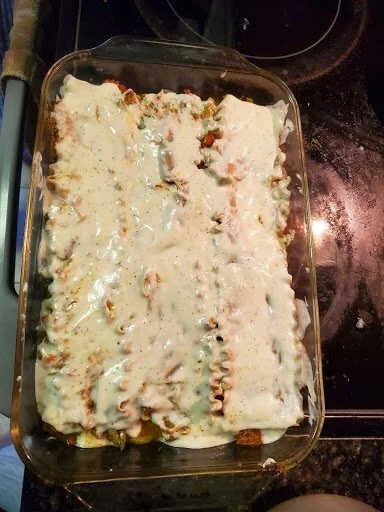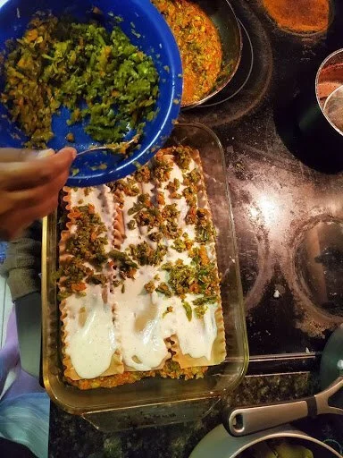 Here is our veg-lasagna-out-of-scraps, which came out so good that we had to take leftovers for our friend to try and give their seal of approval! (Yes, we did get that approval :)